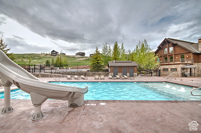 Community pool featuring fence, a water slide, and a patio©UtahRealEstate.com. All Rights Reserved. Information Not Guaranteed. Buyer to verify all information. [ ]