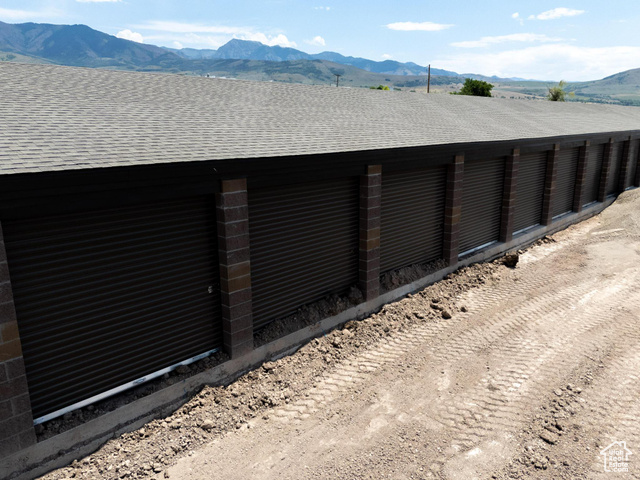 Garage featuring a mountain view